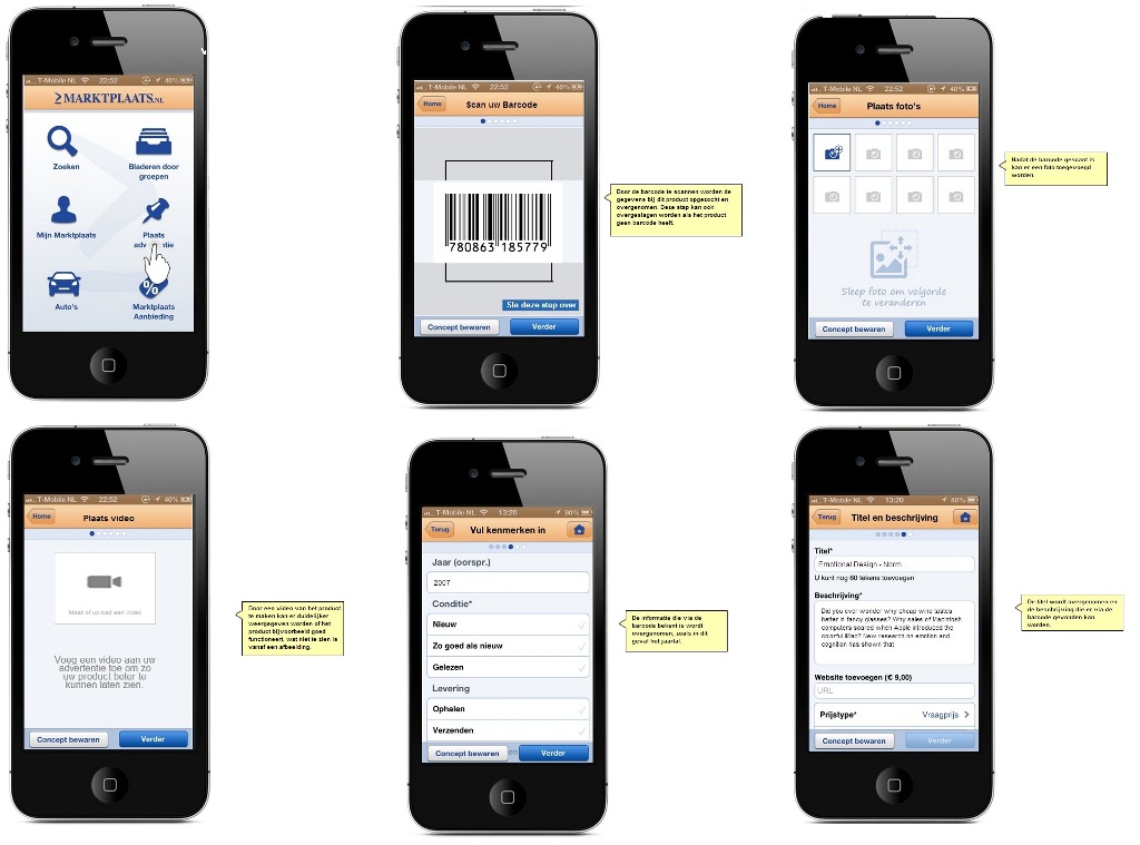 Voor opdracht drie heb ik getest of het plaatsen van een advertentie via mobiel te verbeteren is. Bij de huidige app is dit wel mogelijk maar het bestaat uit veel stappen en alles moet zelf getypt worden wat op een mobieltje lastig kan zijn als iemand een verhaaltje bij zijn advertentie wilt typen. Ik ben tot de conclusie gekomen dat dit een functie is die erg op prijs werd gesteld. Ik heb dit getest door een 21 jarige persoon die wel eens op Marktplaats geadverteerd heeft deze versie van de app voor te leggen. Ik heb vervolgens gevraagd hoe de persoon te werk zou gaan om een advertentie te plaatsen van het pak drinkyoghurt dat hij toevallig voor zich op tafel had staan. Uit deze test bleek dat de gebruiker meteen de eerste stap zag dat de barcode gescand kon worden en dit ook zei en 'deed'. Daarna op de pagina om foto's toe te voegen deed hij dit ook automatisch, zelfs een 'selfie' met het pak bleef niet uit. Bij het filmpje deed de proefpersoon een soort 'Tell Sell' reclame na, en hij liet weten dat hij dit een erg handige toevoeging vond, maar dat het wel redelijk pixelig beeld zou zijn met telefoons met een oudere camera en dat het dan dus weinig zou toevoegen. Ook maakte de proefpersoon zich zorgen over het datagebruik van zijn mobiele internet dat het uploaden van een filmpje zou verbruiken. Het product was bekend bij Marktplaats dus waren de gegevens al ingevuld, proefpersoon zei 'Mooi, kunnen we door' en klikte op 'Verder' zonder verder zorgvuldig de gegevens door te lezen, ik vroeg of alle gegevens klopten waarna de proefpersoon op 'Terug' klikte om het nog eens te checken. Titel en beschrijving begon de proefpersoon direct in te vullen, ik vroeg nog wat hij zou doen als ze er al stonden, waarop hij zei dat hij ze dan evengoed zou vervangen om er een persoonlijke draai aan te geven.